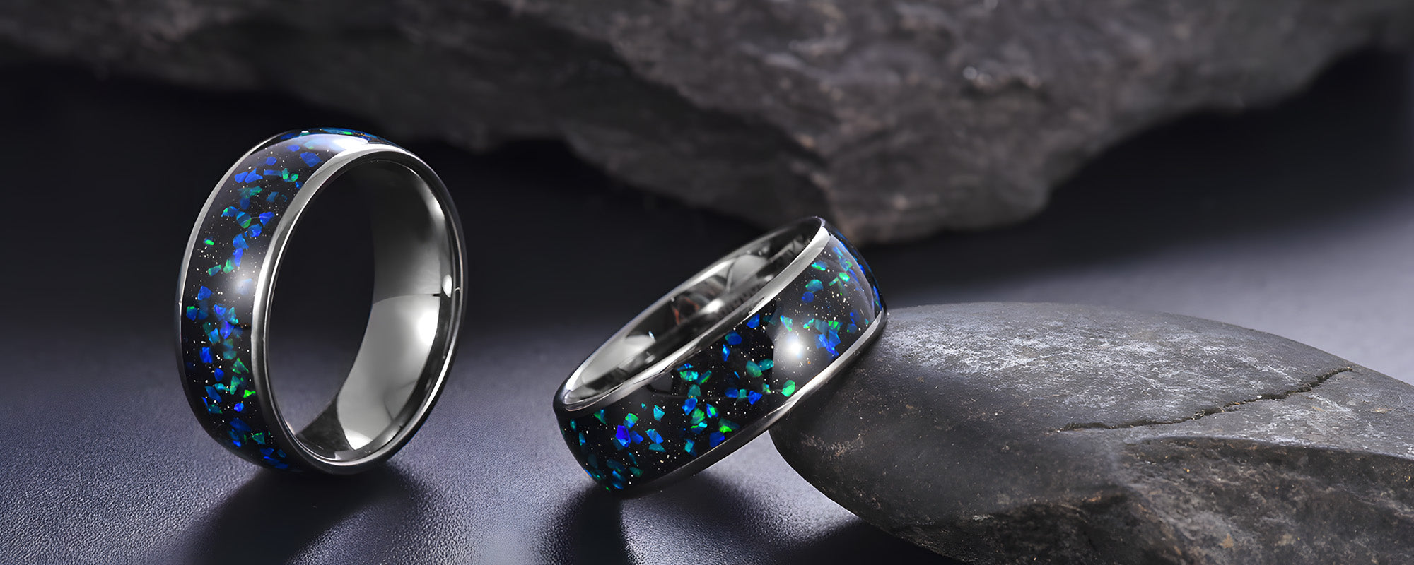 The Hioleegi dome rings with polish edge, owns exquisite craftsmanship with opal stones inlay, elegant and contemporary tungsten rings for women men, let it be the first choice as a substitute for precious metal wedding rings.
